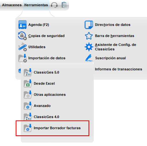 En ClassicGes puedes acceder al importador de borrador de facturas desde dos vías: