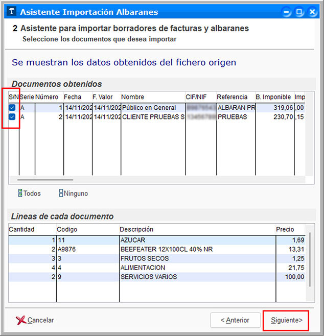 Pulsa Aceptar y aparecerá la segunda pantalla del asistente, donde se muestran los datos obtenidos del fichero de origen. En este momento puedes seleccionar los documentos que quieres importar a ClassicGes y verificar las líneas importadas de cada uno. Si estás de acuerdo con la importación, pulsa Siguiente.