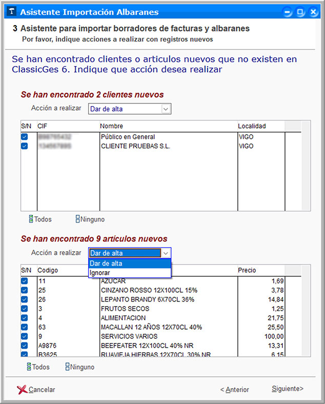 A continuación se muestran los clientes y/o artículos nuevos que se han encontrado en los documentos (y no existen previamente en ClassicGes). En el desplegable Acción a realizar puedes indicar si quieres darlos de alta en el programa o no.