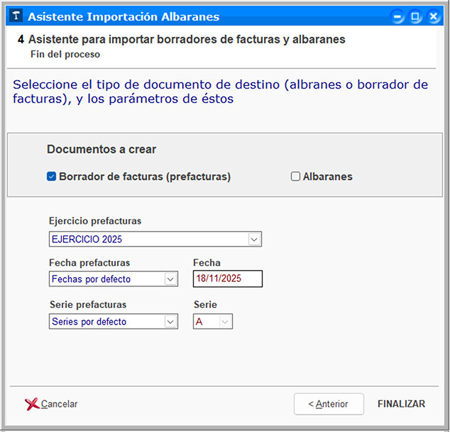 En la siguiente pantalla del asistente indica el tipo de documento de destino, es decir, si quieres que los datos importados se conviertan en borradores de facturas o en albaranes. En el caso de pre- facturas también puedes seleccionar el ejercicio, la fecha y la serie.