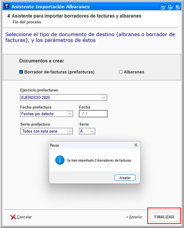Al pulsar Aceptar el programa avisa que se han importado los borradores de facturas. Pulsa Finalizar para terminar el proceso.